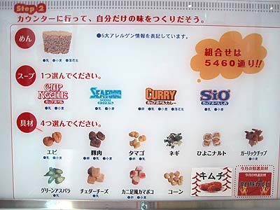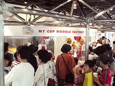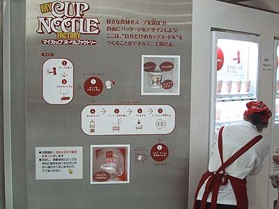また、世界的に空前のヒット商品と行っても良いカップヌードルの具材、スープを選んで自分だけのカップヌードルを作る事の出来る「マイカップヌードル・ファクトリ」があり、カップだけを購入し(5/1現在1ヶ300円)、カップのデザインを自分でマーカー等で書き込みます。そこからスープを4種類の中から選択、さらに12種類の具材から4種類を選択して、封をします。シュリンクパッケージしてもらい、世界に1つだけのカップヌードルを作る事が出来ると言う趣向です。