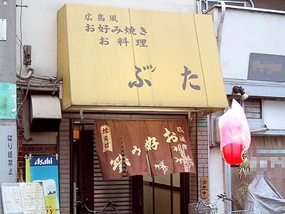 でも、店の名前に「ぶた」って言われるとなんか躊躇してしまいます。「太るの?」とか、「店でブタって言われへんねやろか?」とか、「豚玉、ミックス、ブタえびとかブタの入ったメニューしか無いんやろか?」などと、いろいろと想像が膨らんできてしまいます。しかしよ〜っく見ると「ぶ」の濁点が多くなにやら書き込まれていて、決してテントの汚れではなさそうです。